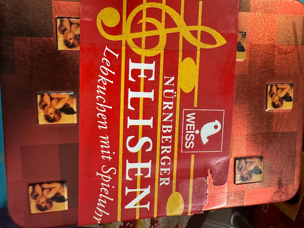 Vtg Weiss Nurenberger Music box tin. Plays White Christmas. Available in Paula's Porch