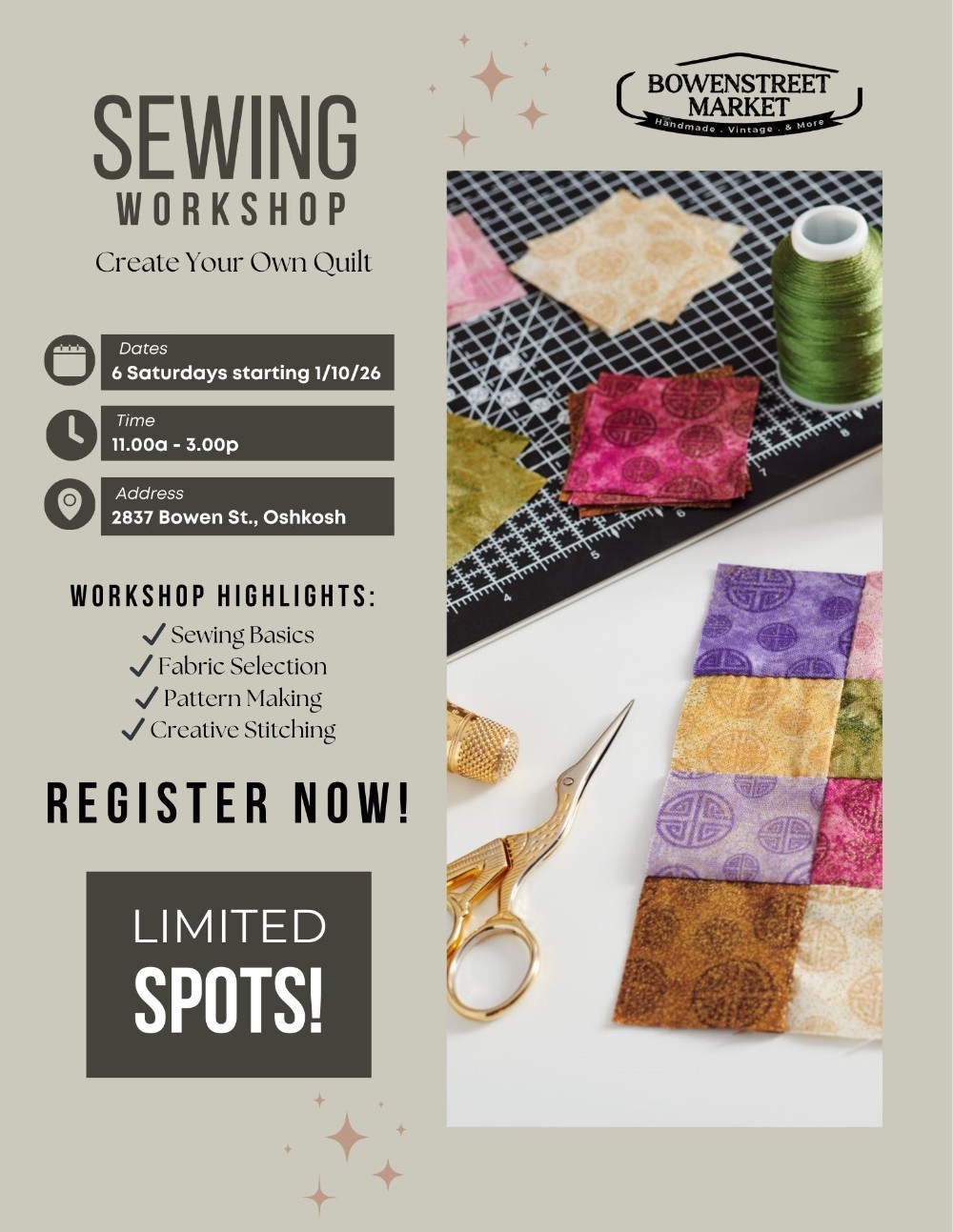 Whether you’re brand new to quilting or looking to build confidence and skills, this workshop will guide you through a project from start to finish. Limited spaces available, so be sure to sign up soon!