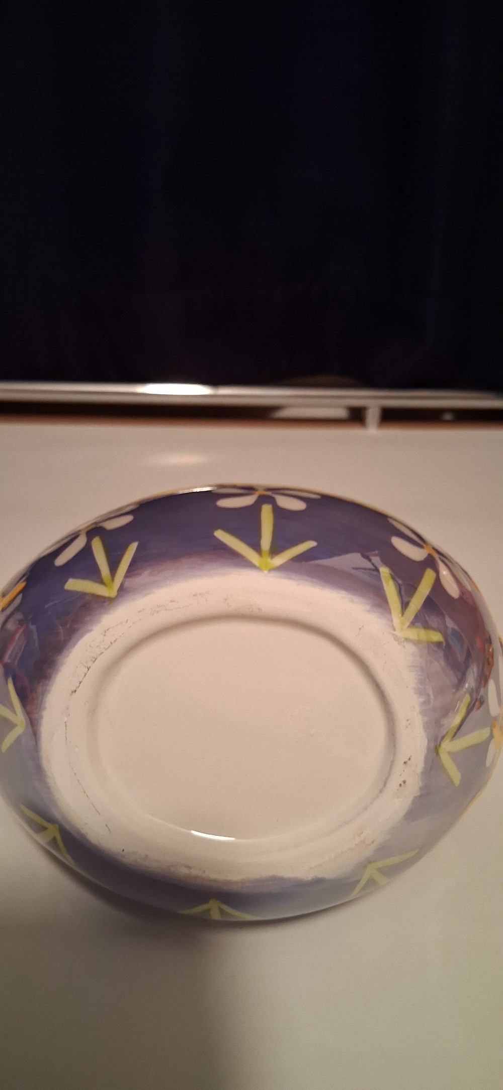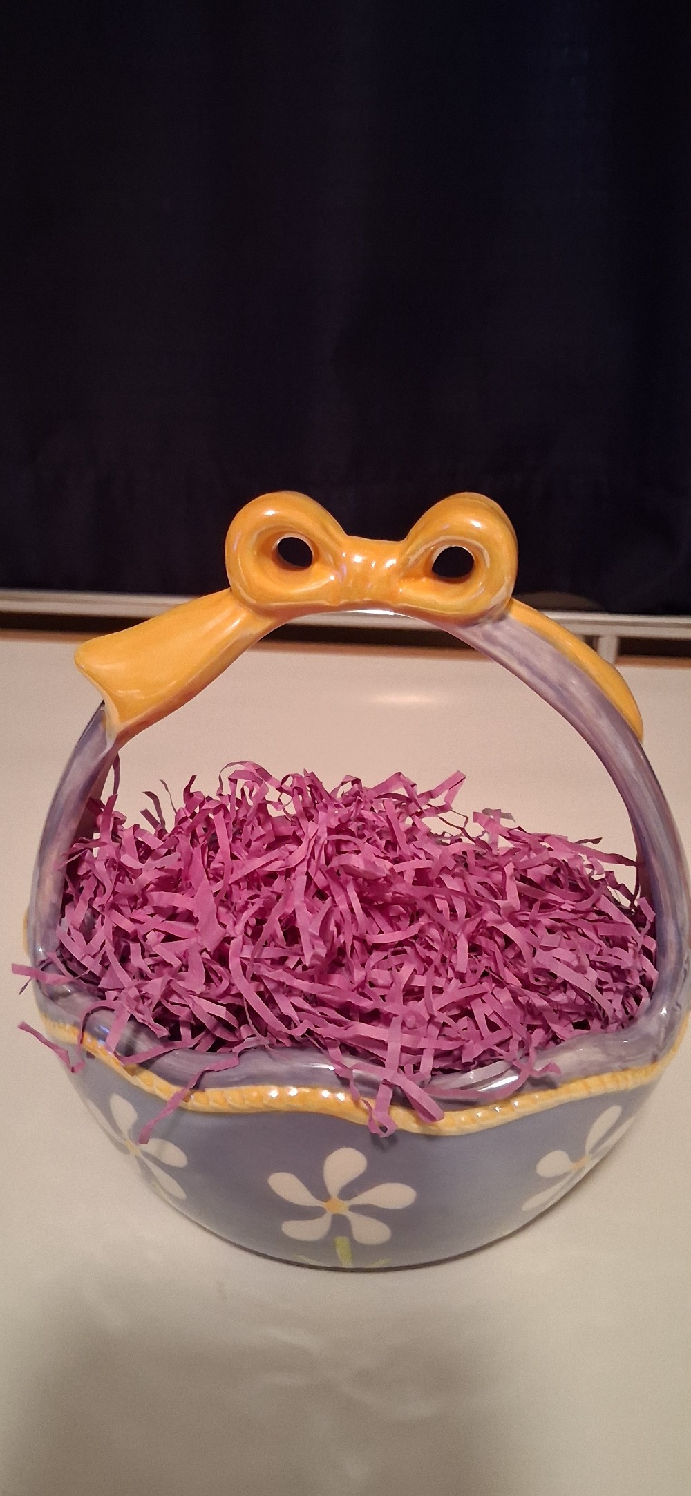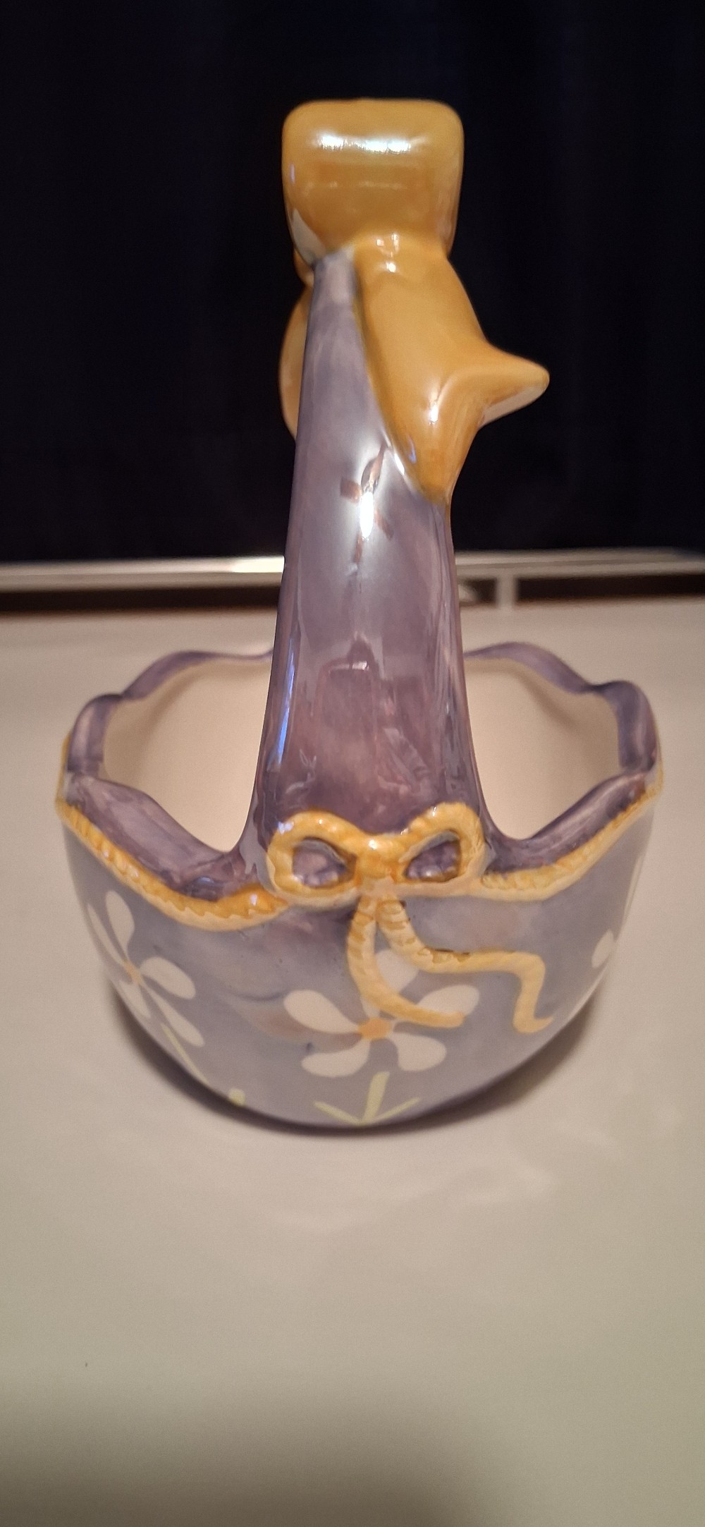 Stunning glaze on this purple basket. White daisies have yellow centers and green stems. 6" tall and 6" wide. No cracks, crazing or chips.