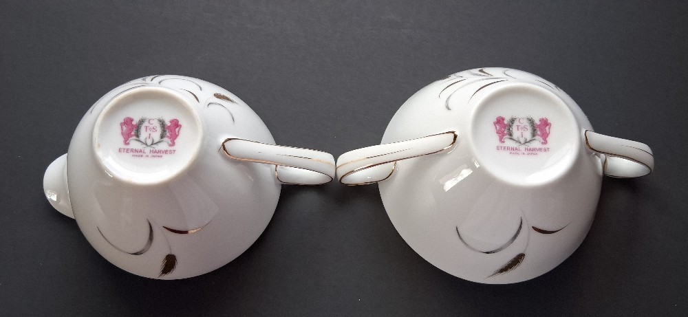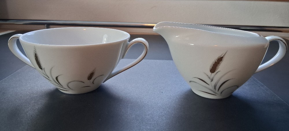 A pair of creamer (or gravy bowl) and sugar bowl in Eternal Harvest pattern made in Japan. The pattern is of golden wheat. The creamer is rimmed in gold on the top and handle. The sugar bowl is sadly missing its lid. It is lined with gold on the handles. One side has a set of wheat motiff while other side has one. You could insert little packages of sugar or sugar substitutes in the sugar bowl. The set should be hand washed. Minimal loss of gold paint at very bottom of each item's handles. In very good condition considering their age. No chips or cracks.