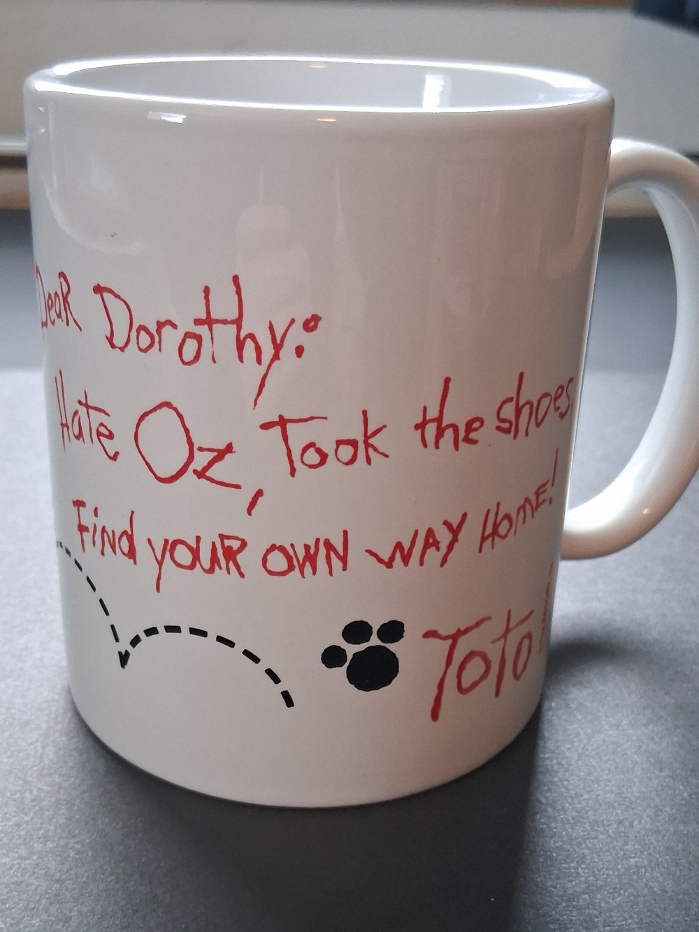 Made by The Resort Inc. Great Collectible for Wizard of Oz fans! Funny! Toto left a note: Dear Dorothy, Hate Oz, Took Shoes, Find Your Own Way Home. Paw Print, Toto! No utensils marks. No chips or cracks. Great Condition!